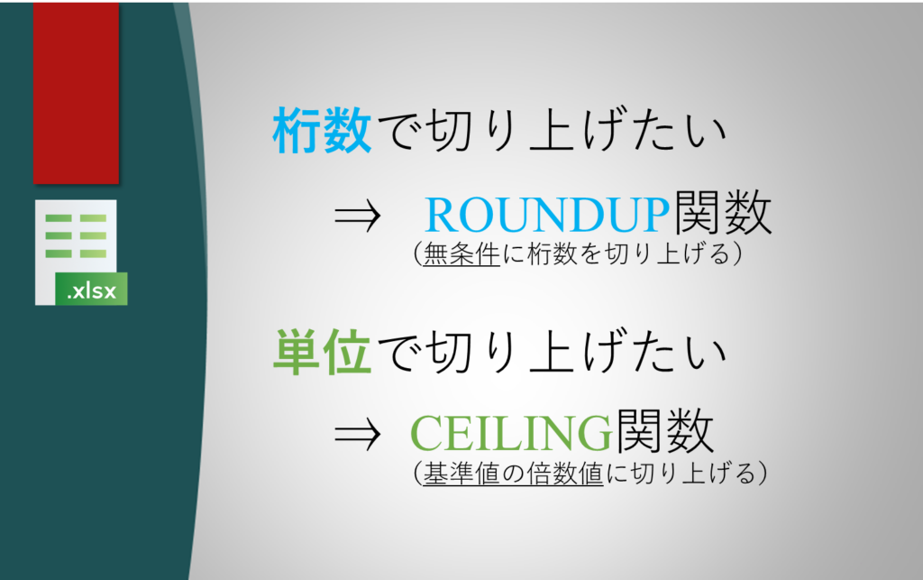 ROUNDUP 関数と CEILING 関数は、どちらもExcelで数値を切り上げる際に使用されますが、その処理方法に違いがあります。ROUNDUP 関数は、指定した桁数まで四捨五入せずに、常に数値を切り上げます。例えば、ROUNDUP(3.14, 1)