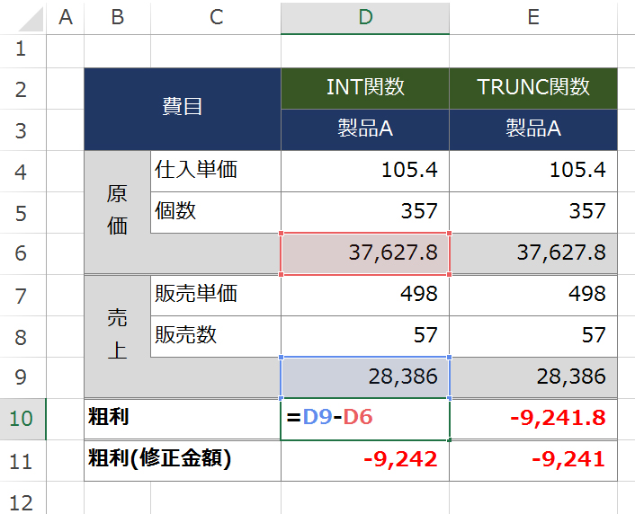 と入力すると、-124が返されます。このように、INT関数は数値を最も近い整数に丸めるため、負の数値ではTRUNC関数とは異なる結果を導き出すことがあります。