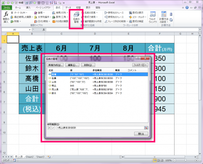 名前の設定は、[公式] タブの [名前の定義] ボタンから行います。ここで、指定した範囲に名前を付けることができます。また、既存の名前を編集したり、削除したりすることも可能です。名前を設定した後は、その名前を使って数式を入力することができます。例えば、A1:A10 の範囲に「Sales」の名前を設定した場合、SUM 関数でその範囲の合計を求めるには、SUM(Sales)