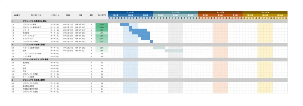 ガントチャートテンプレートは、プロジェクト管理において非常に効果的なツールです。Excelのガントチャートテンプレートを使用することで、複雑なスケジュールを視覚的に把握し、タスクの進捗状況や優先順位を一目で確認できます。テンプレートには、プロジェクトのタイトルや概要、各タスクの名称、期間、責任者、進捗率などの重要な情報を記入する欄が用意されています。また、タスクのグループ化や色分けにより、プロジェクト全体の流れをより明確に把握することが可能になります。