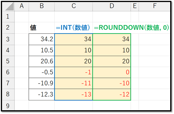 負の数値の場合、INT関数は小数点以下を切り上げるという特徴があります。つまり、-3.7をINT関数で処理すると-4となります。これに対して、ROUNDDOWN関数は負の数値でも指定した桁数で切り捨てを行います。したがって、-3.7をROUNDDOWN関数で1桁目で切り捨てる場合は-3.7となります。