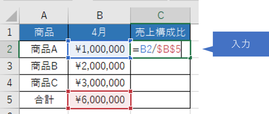 Excelで売上高の構成比を計算するには、まず全体の売上高と各商品の売上高を用意します。全体の売上高は、例えばA1セルに合計値として入力します。各商品の売上高は、B2、B3、B4などのセルに個別に入力します。次に、各商品の売上高を全体の売上高で割ることで、その商品が全体の売上高に占める割合を計算します。例えば、C2セルには「=B2/$A$1」の式を入力します。この式は、B2セルの値をA1セルの値で割る計算を行います。