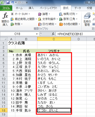 と入力することで、指定された文字列のふりがなを取得します。例えば、セルA1に「田中」が入力されている場合、=PHONETIC(A1)