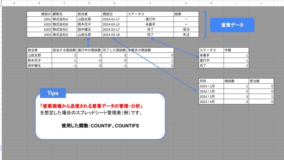 これらの関数は、データの分析や集計に欠かせないツールです。実際の業務では、これらの関数を活用することで、データの管理や分析がより効率的になります。例えば、営業活動の評価では、特定の目標を達成した営業員の数を素早く把握することで、業績の評価や報酬の決定に役立てることができます。また、マーケティング活動では、キャンペーンの効果を測定するために、特定の条件を満たす顧客の数をカウントし、戦略の改善に役立てることができます。
