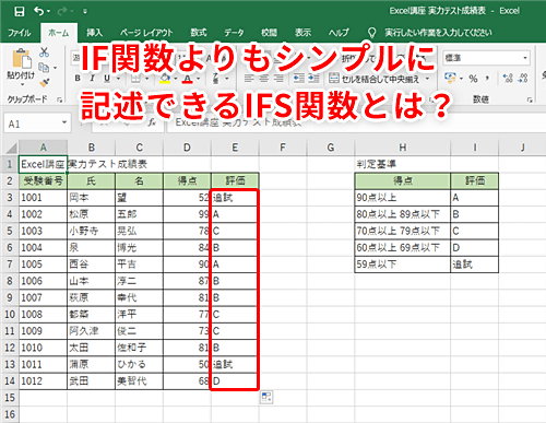 =IFS(売上>=150000, "トップクラス", 売上>=100000, "優秀", 売上>=50000, "平均", 売上<50000, "改善要")