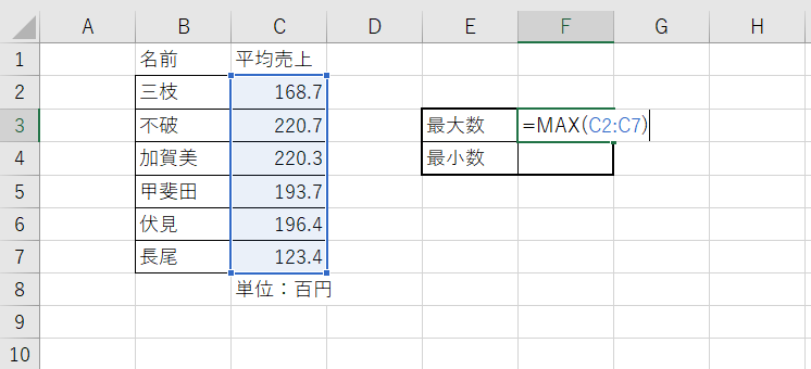 と入力することで、B1からB10までのセルの平均値を取得できます。