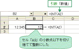 という形式で関数を入力します。例えば、A1 セルに 12.75 という値が入力されている場合、B1 セルには =INT(A1)